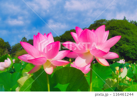 開花した大賀ハスの花と青空(千葉市中央区 千葉公園)