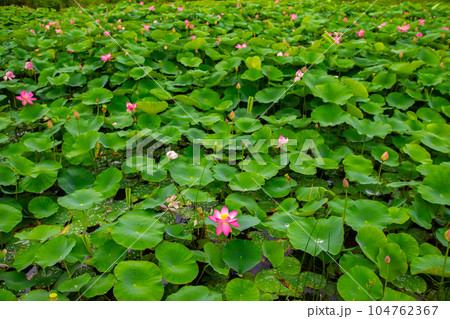 咲き競う朝の蓮池風景 蓮華繚乱蓮池風景