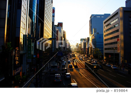 日本の東京都市景観 珍景万華鏡都市。強い光を浴びて汐留タワーが周囲のビルにくっきりと映り込む光景…