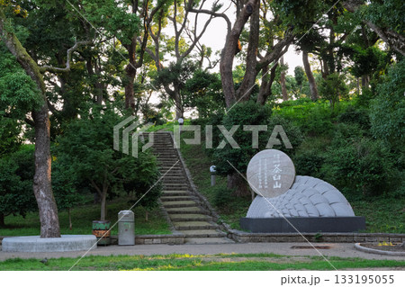 大阪市の天王寺公園、園内にある大阪五低山のひとつ「茶臼山」・麓の遊歩道入口と標石