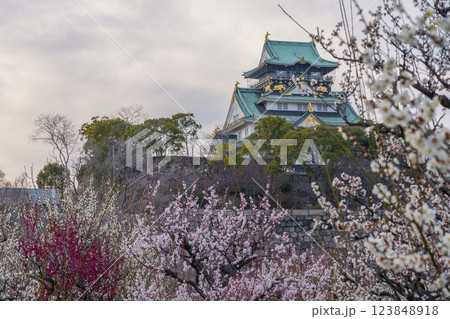 大阪城梅林 満開の梅と夕景に映える大阪城天守閣