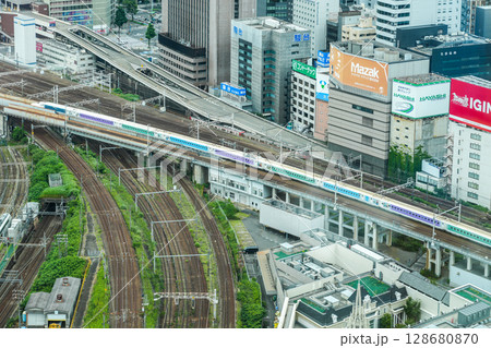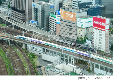 ディズニー新幹線、名古屋駅を通過中(2025年7月撮影)名古屋プリンスホテルスカイタワーより撮影