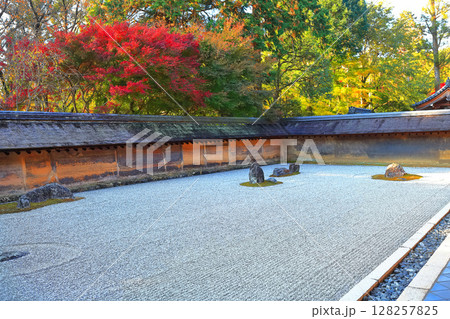 龍安寺の秋、石庭に見頃の紅葉、築地塀「油土塀」の渋い色合い