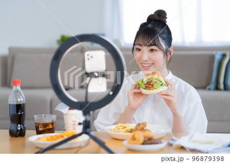 モッパン ハンバーガーを手にライブ配信するユーチューバー