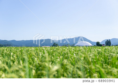 稲穂の出ている田んぼの向こうにハチ公ドーム