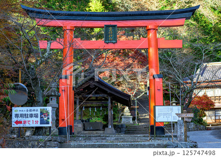 金櫻神社の大鳥居と手水舎を望む参道入口