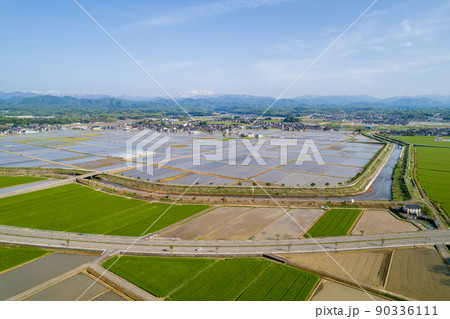 白山を望む平野の水田と緑の麦畑