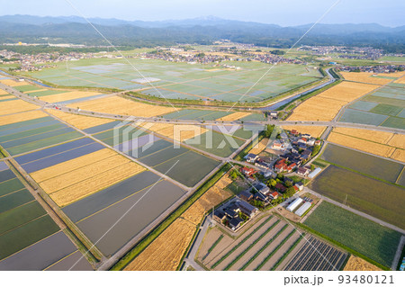 黄金色に輝き収穫期を迎えた麦畑と田畑が広がる金沢平野のドローン撮影写真|石川県能美市