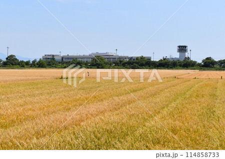 水田と黄金色に輝く麦畑が広がる金沢平野|石川県能美市