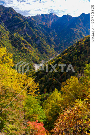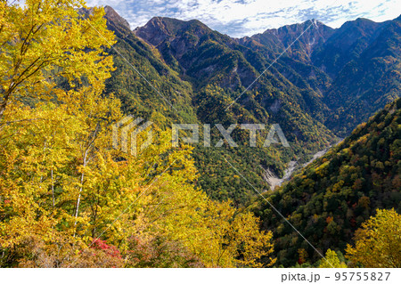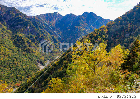 秋 紅葉の南アルプス林道からの絶景 奥に甲斐駒ヶ岳 両側に鋸岳、駒津峰、双児山