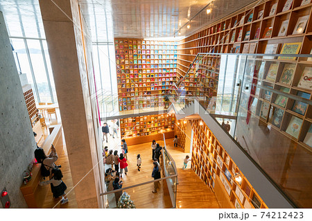 絵本美術館まどのそとのそのまたむこう 天井まで届く絵本の書架は圧巻