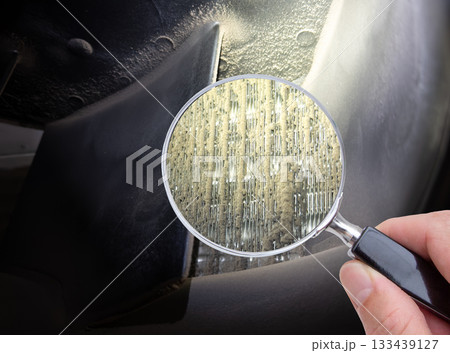 業務用エアコン内部の汚れ カビ ホコリを虫メガネでクローズアップ