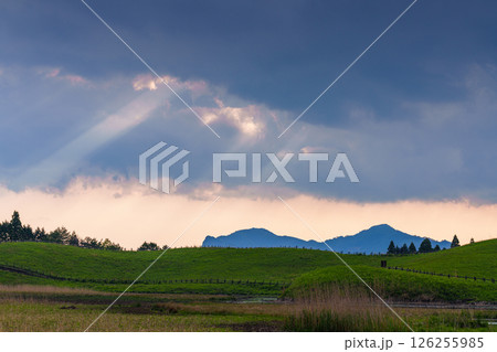 曽爾高原の初夏 垂れ込める雲の間から覗く天使の梯子とお亀池