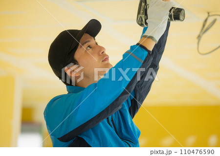 天井を点検する作業着の男性