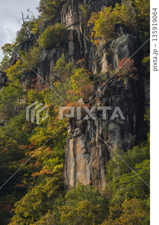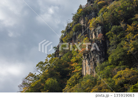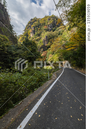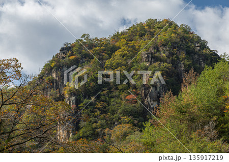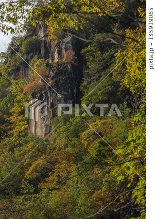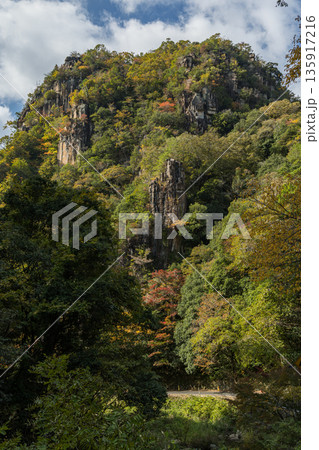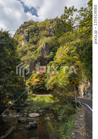 日本 岡山県総社市の高梁川支流槙谷川の上流にある豪渓の紅葉と天柱