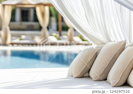 Poolside lounge bed with soft pillows and white curtains, creating a luxurious and relaxing outdoor space.