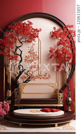 奢華的亞洲風格裝飾,採用紅色和金色色調、圓形框架和華麗的座椅,非常適合節日或文化主題。