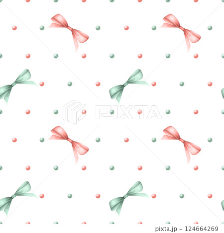 Watercolor coquette bows and beads in pastel red and green colors. Hand drawn seamless pattern isolated on white background for festive packaging paper, textile, wrapping, curtain, scrapbooking paper.