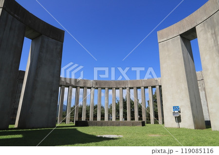 国立天文台 天文機器資料館(自動光電子午環)のレトロな展示物 夏晴れの青空 東京都三鷹市