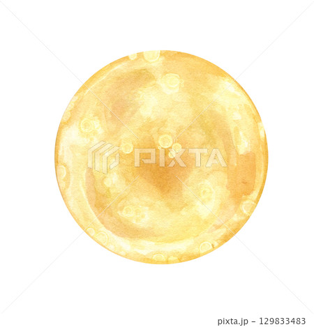 Yellow golden hand painted watercolor round texture like full moon, sun, planet or broth on isolated background. Abstract backdrop, decorative element for Halloween holiday, cooking design, for text.