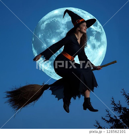 月夜に魔法の箒で空を飛ぶ魔女の写真風イラスト