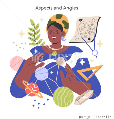 Natal Chart concept. An astrologer interprets cosmic relationships with planets and symbols. Astrological guidance, zodiac signs, and celestial mapping. Vector illustration.