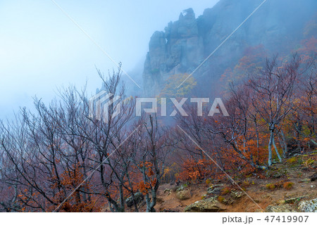 Mystical autumn forest scene with fog-shrouded trees and a carpet of fallen leaves creating a tranquil and ethereal landscape.