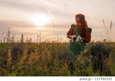 A shepherdess woman with red hair and a green dress sits in a field of flowers.
