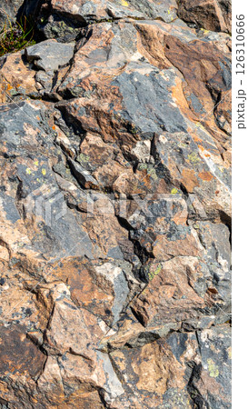 何層にも重なり剥離した灰色とオレンジ色の美しい地層テクスチャ