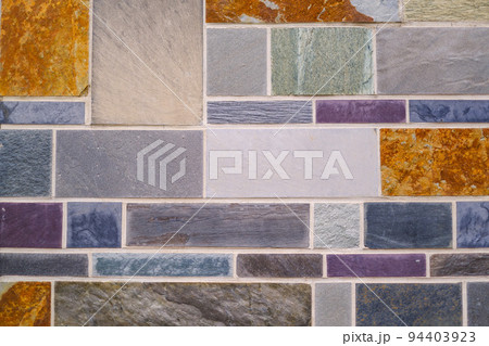 さまざまな色味の石材をタイル状に組み合わせたカラフルな石壁