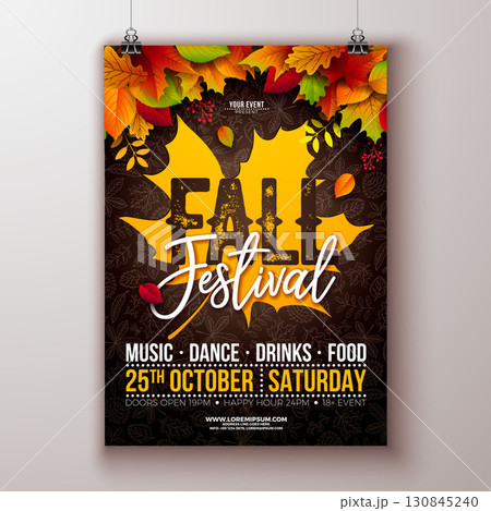 Autumn Fall Festival Party Flyer Illustration with Falling Leaves and Typography Lettering on Hand Drawn Doodle Background. Vector Colorful Autumnal Design for Celebration Flyer, Banner, Invitation or