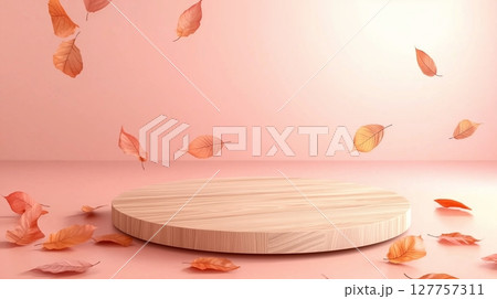 Yellow autumn leaves and simple wooden podium stage display promotion pink background