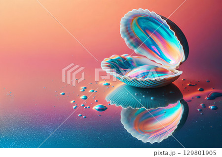 Glossy surface with open shell reflecting blue, turquoise, pink, and purple hues. Coral-peach gradient background creates ethereal light play. Captivating image with vibrant iridescence,