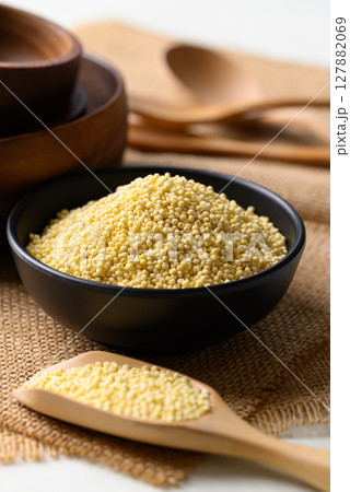Yellow millet grain in black bowl with scoop, Food ingredient