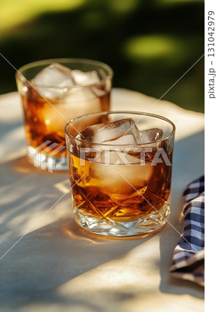 Two Crystal Glasses Filled With Brown Liquor and Ice Sit on a Table Outdoors in Warm Sunlight