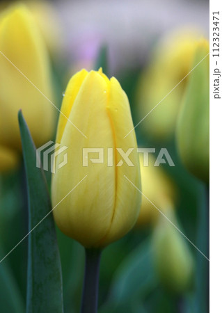 在下雨天拍攝花園裡沾著雨水的黃色鬱金香