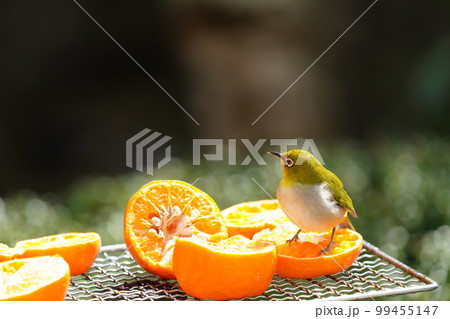 庭に置いた美味しいミカンにかぶりつくヒヨドリ