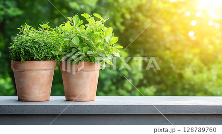 Fresh Herb Plants in Teracotta Pots on Sunlit Balcony with Green Background