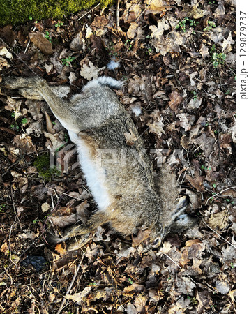 Dead hare lies on autumn leaves