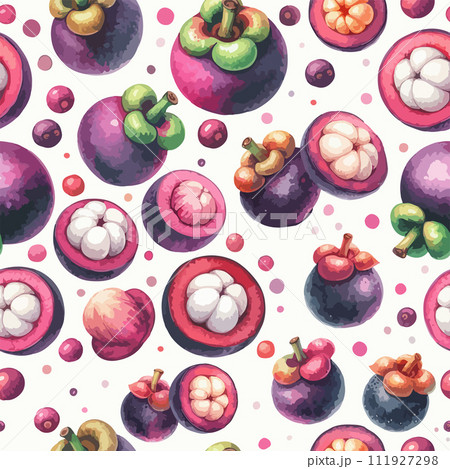 Seamless vector watercolor pattern of tropical mangosteen fruit. Mangosteen, passion fruit.