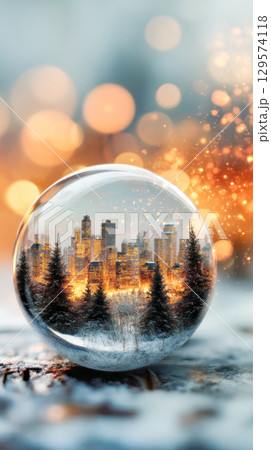 Snow globe featuring a winter cityscape with glowing lights and evergreen trees, creating a magical holiday atmosphere and festive spirit