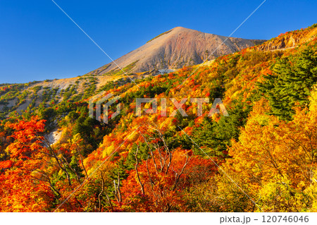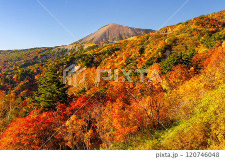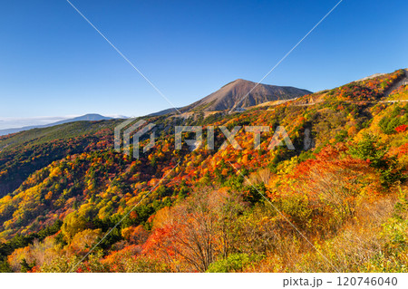 福島県福島市 高湯温泉と土湯峠を結ぶ磐梯吾妻スカイライン 天狗の庭付近の鮮やかな紅葉と吾妻小富士