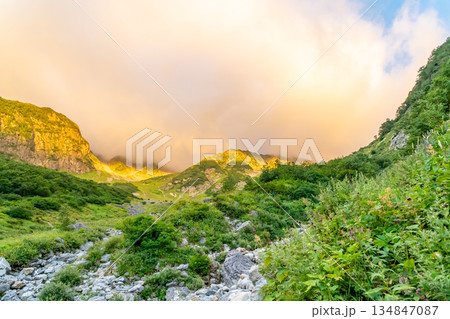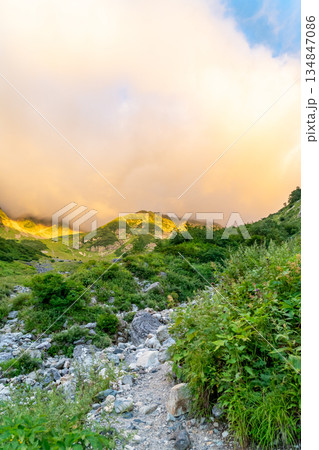 槍沢登山道から見上げるモルゲンロートの中岳 槍沢から大キレット縦走登山