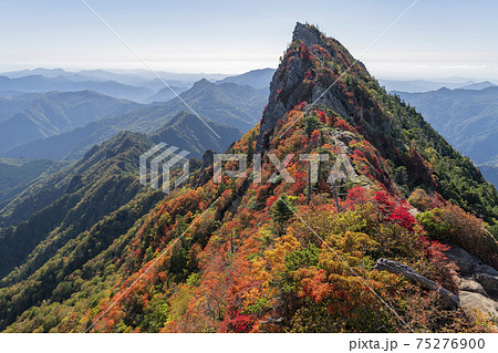 秋晴れの青空を背景に紅葉に染まる石鎚山天狗岳 Ver1