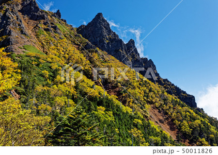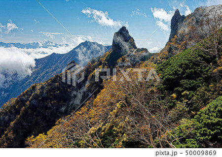 滋賀県のT字尾根から見上げる紅葉した御池岳の天狗の鼻とボタンブチ