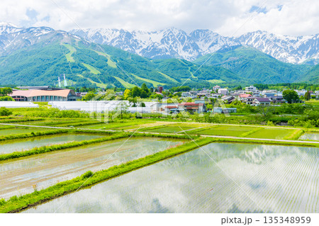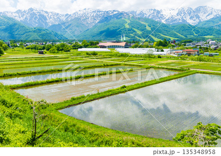 初夏の長野県白馬村 田植え期の水田と残雪の白馬連峰