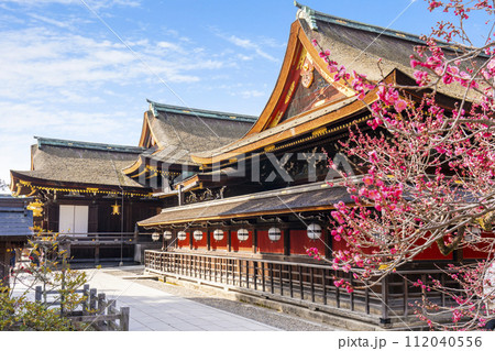 早春の京都 北野天満宮 紅梅と本殿・透塀