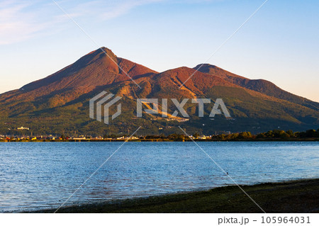 早朝の猪苗代湖と磐梯山・天神浜(福島県・猪苗代町)