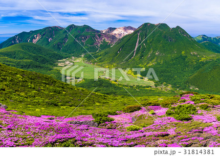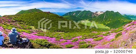 ミヤマキリシマ満開のくじゅう連山を望む登山者