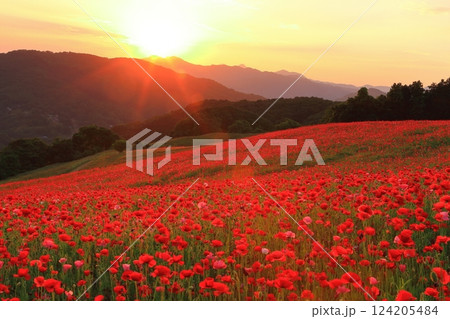 夕日に染まる彩の国ふれあい牧場のポピー